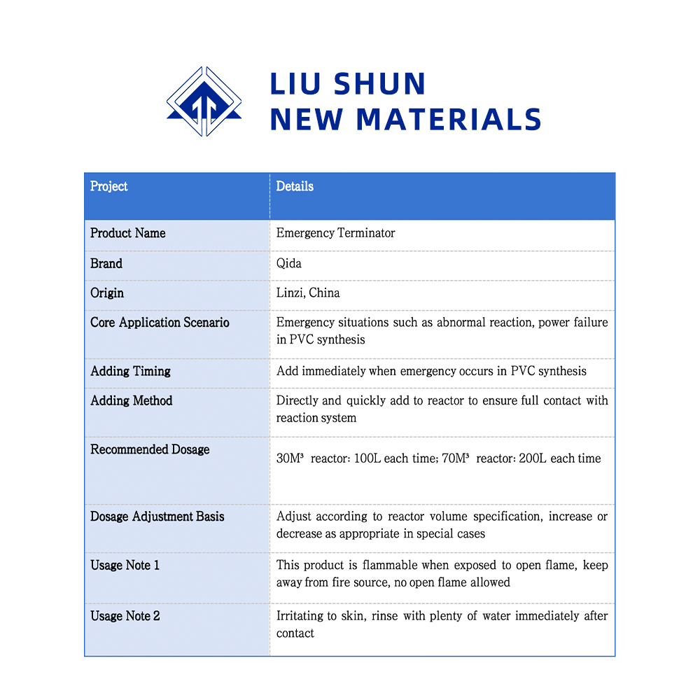 Агент аварийной остановки в основном используется в процессе синтеза поливинилхлорида, и его следует добавлять в чрезвычайных