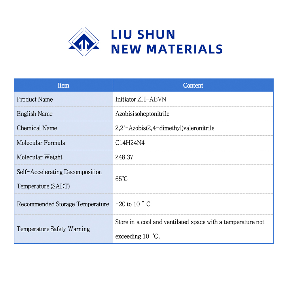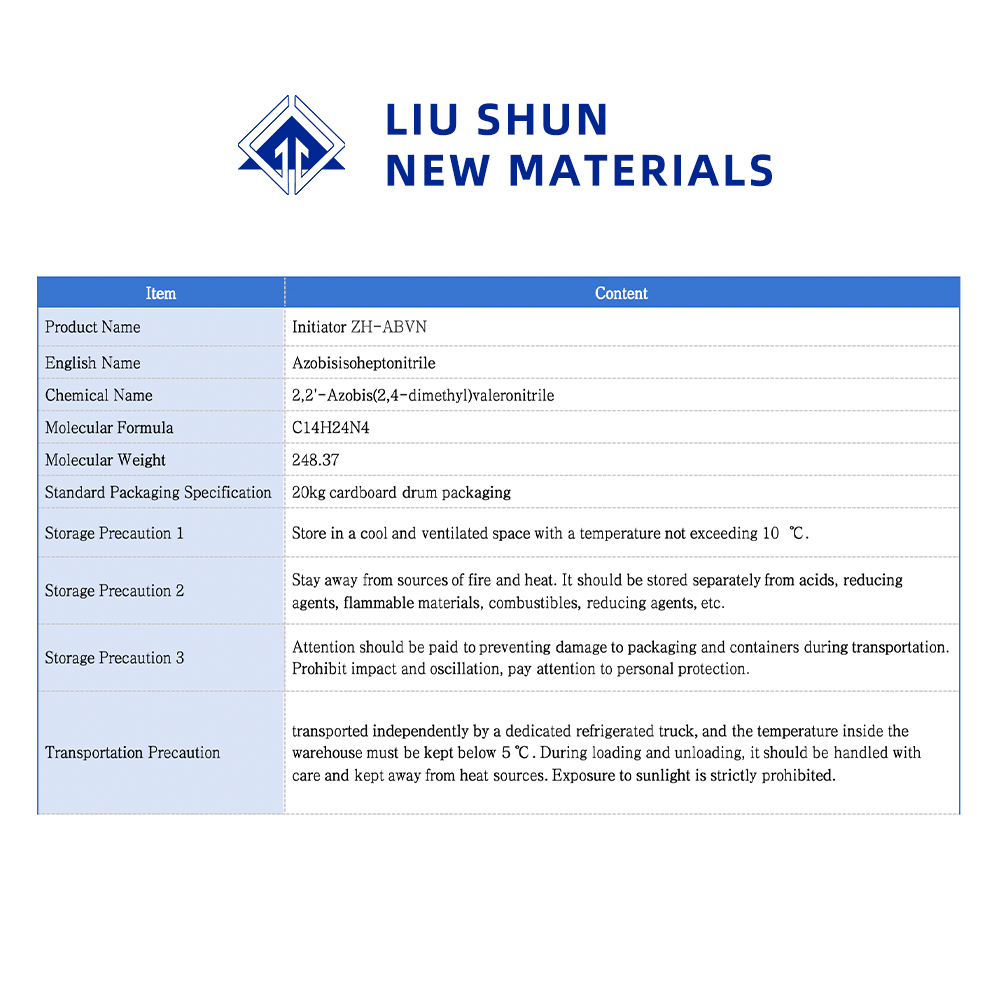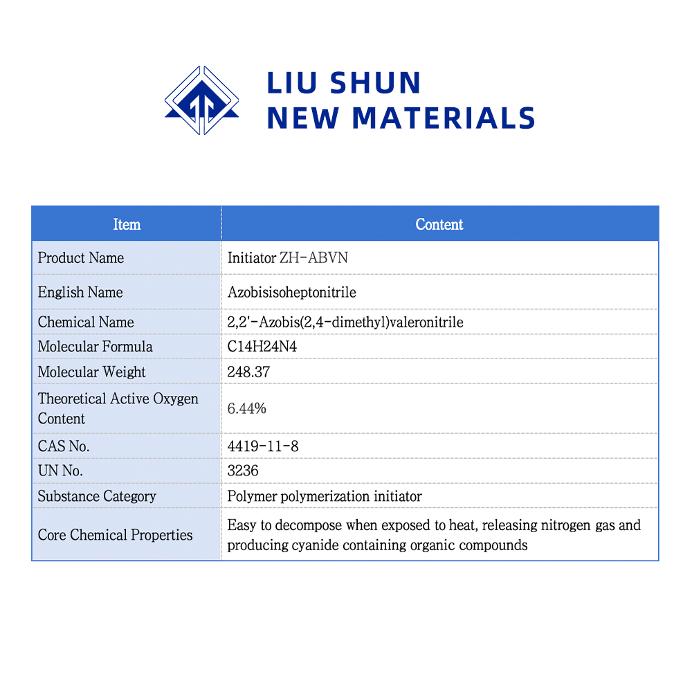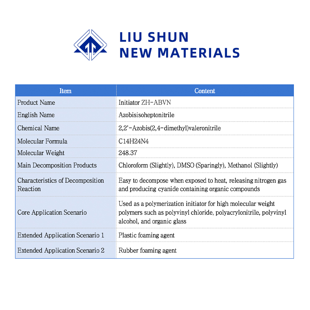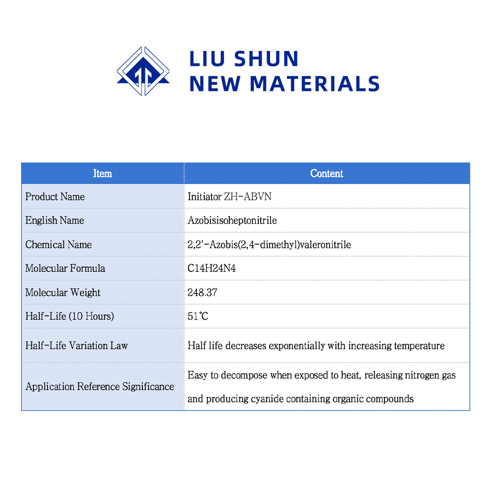 Азобисовалеронитрил является высокомолекулярным инициатором полимеризации, который отличается высокой эффективностью инициирования, стабильной реакцией и превосходным качеством полимера. Широко используется в качестве инициатора полимеризации поливинилхлорида, полиакрилонита, поливинилового спирта и органического стекла, а также в качестве пенообразователя пластмасс и резины.