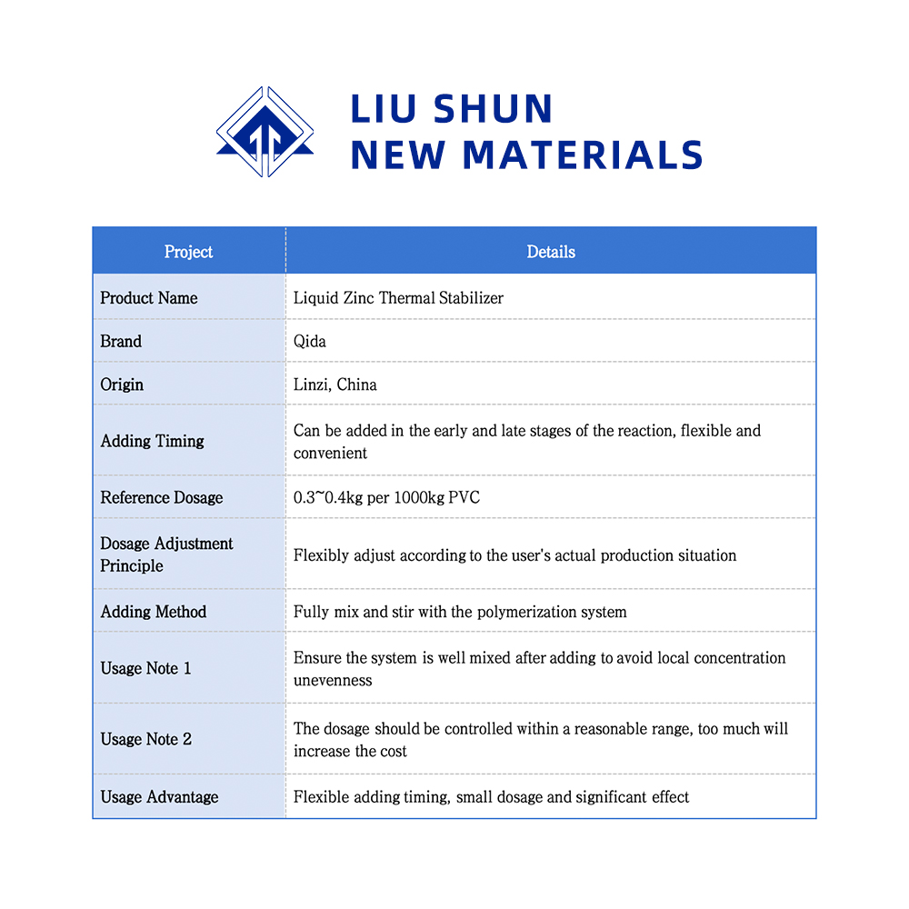 Жидкий цинк служит широко используемым термостабилизатором в рецептурах полимеризации винилхлорида (VFC). Он эффективно