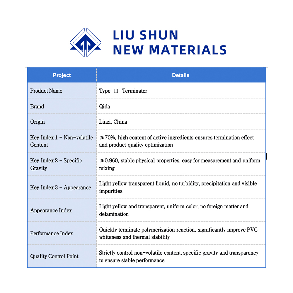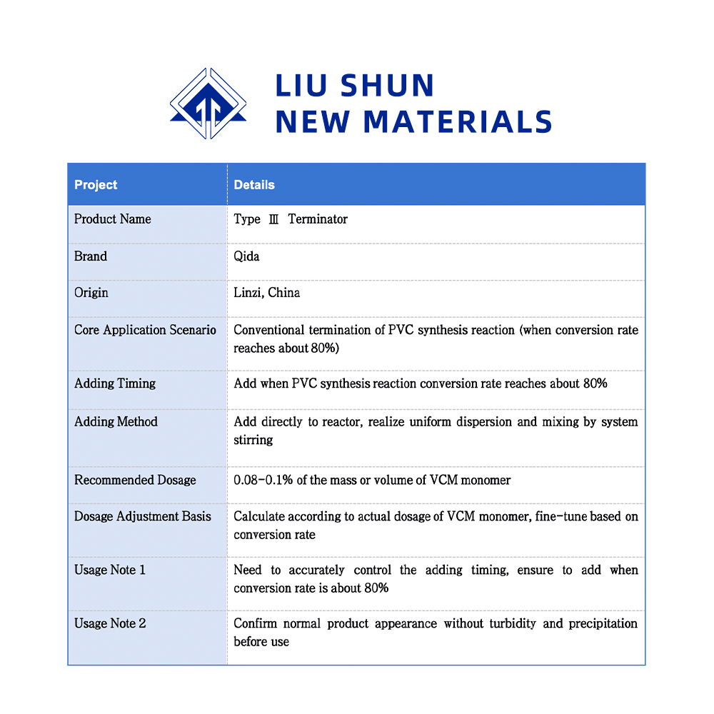 Этот продукт добавляется, когда степень конверсии синтеза ПВХ достигает примерно 80%, при этом дозировка равна объему мономера ВХМ. 0,08-0,1%.