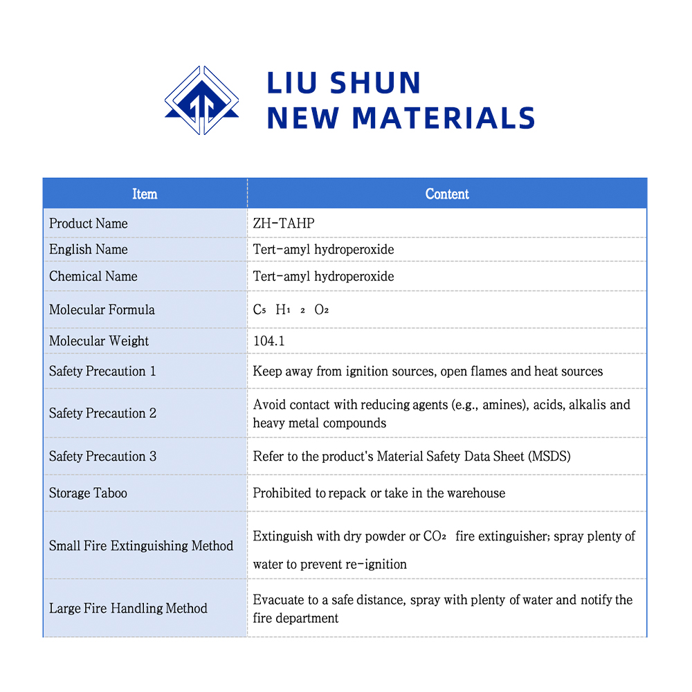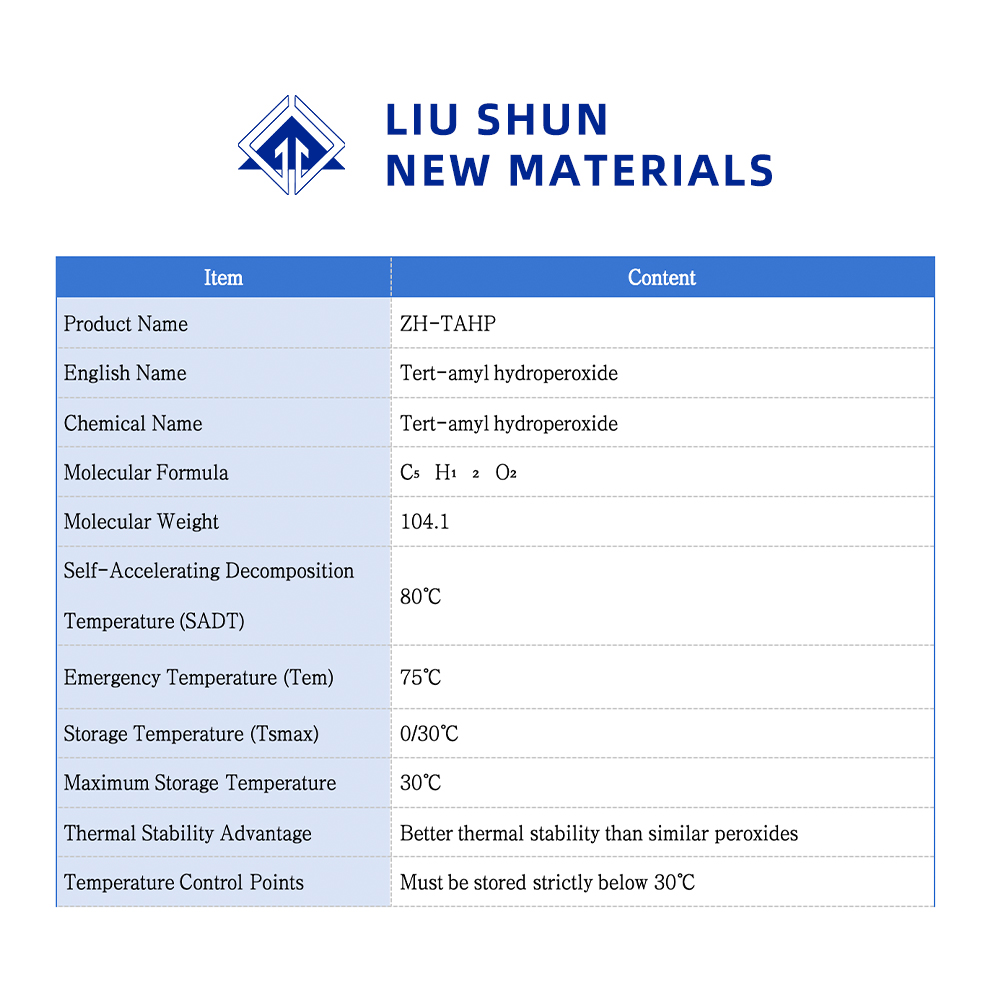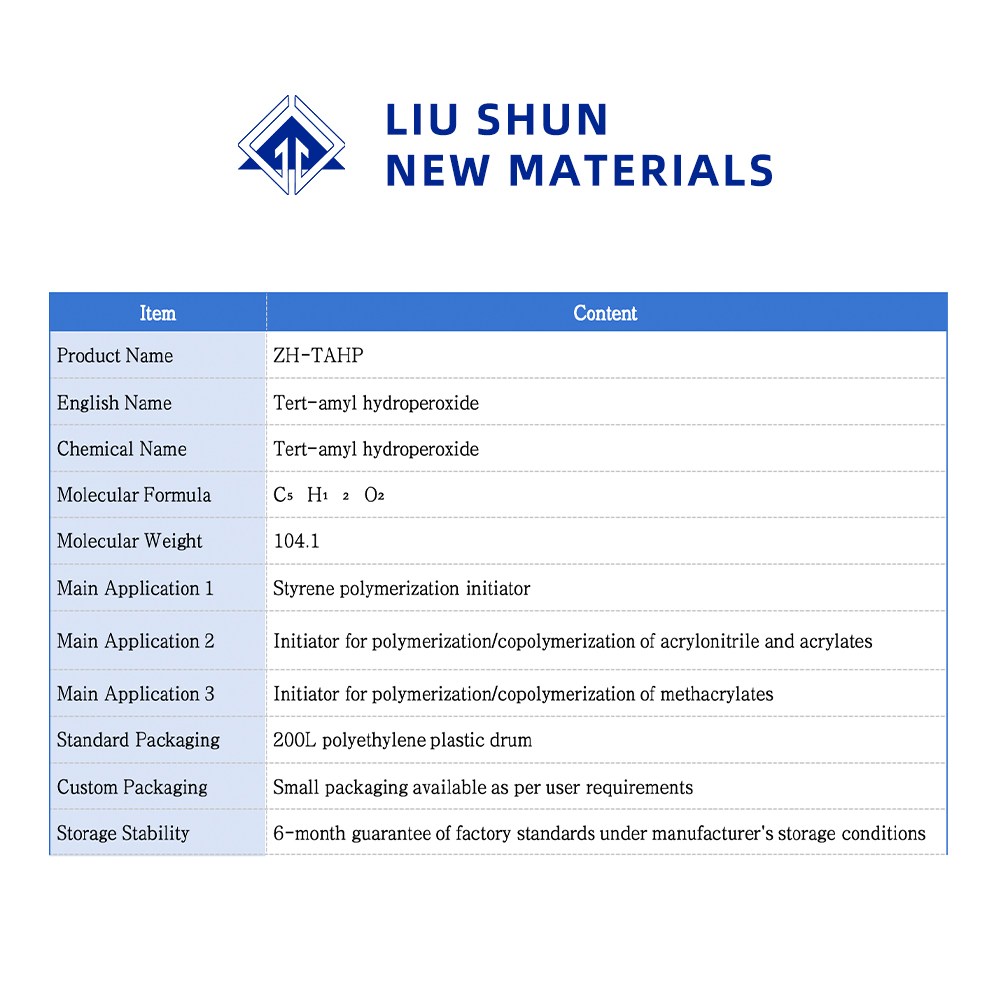 TAHP - один из наиболее часто используемых инициаторов свободнорадикальных реакций, который характеризуется хорошей термостабильностью, безопасностью применения, простотой контроля, трет-амилгидропероксид представляет собой бесцветную или бледно-желтую прозрачную жидкость, представляет собой органический пероксид алкилводорода, который выступает в качестве инициатора полимеризации или сополимеризации стирола, акрилонитрила, акрилового эфира и метилакрилата.