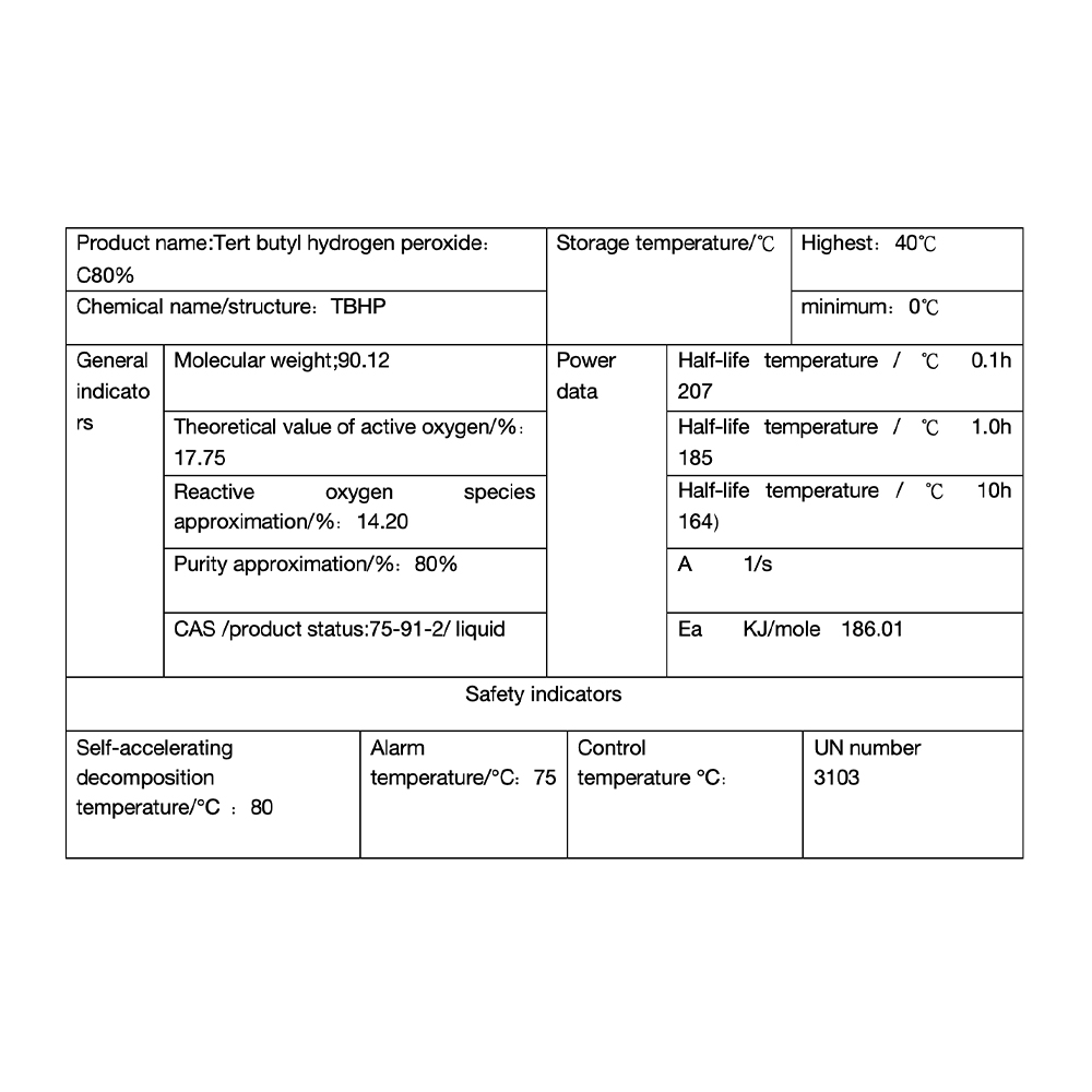 TBHP является одним из наиболее распространенных инициаторов свободнорадикальных реакций, который характеризуется хорошей термической стабильностью, безопасным использованием, простым контролем, отсутствием значительных изменений активности в течение трех месяцев при температуре ниже 40 ℃, необходимостью дорогостоящего хранения в замороженном виде и может использоваться в эмульсии.